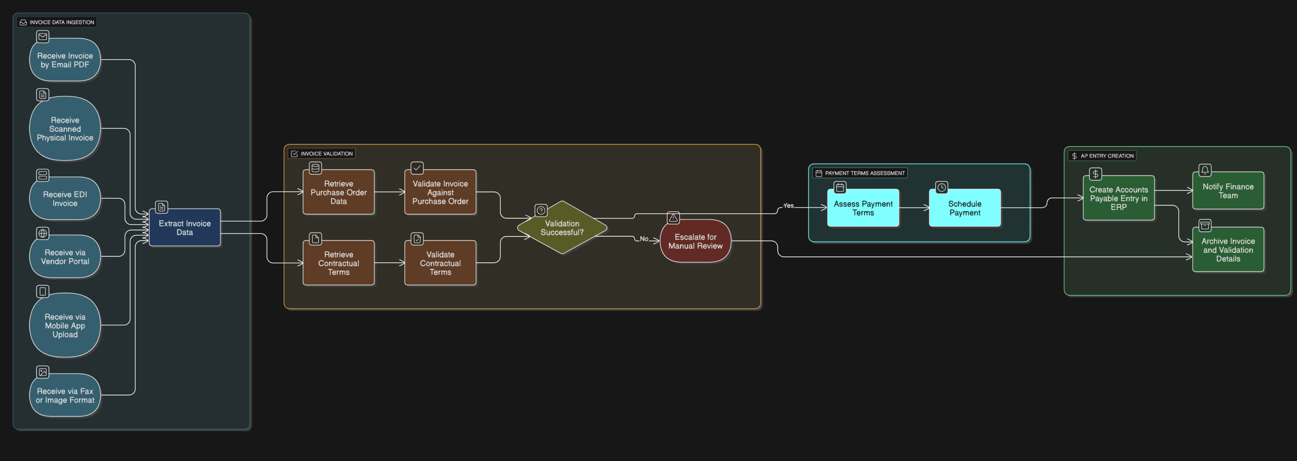 Ingest incoming invoice data, invoices can be received on mail in PDF format or in form of scans of physical invoices. Once the data is ingested, validate invoice data against PO’s issued to the vendor and access any contractual terms available for payment (Example: Payment will be processed after 30 days of material receipt) and based on this information create an AP entry in the ERP or Finance System.
